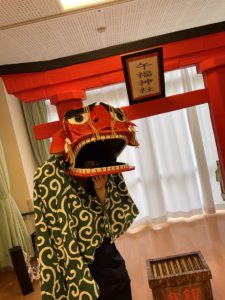 当日は、職員が獅子舞や神主様、巫女様に仮装して登場し、会場は一気にお正月らしい華やかな雰囲気に包まれました。