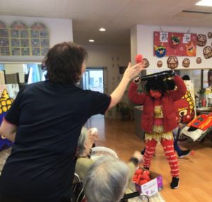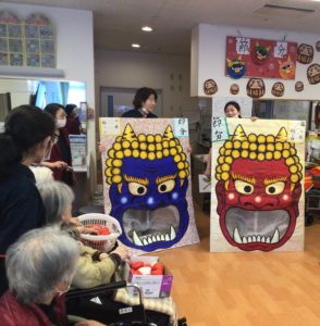 今月の護療舎デイサービスでは、季節の行事として節分のレクリエーションを実施しました。職員が鬼に扮して登場すると、利用者様からは驚きと歓声があがり、会場は一気ににぎやかな雰囲気に。